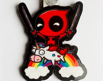 Real metal pin features an image of deadpool riding a magical unicorn.